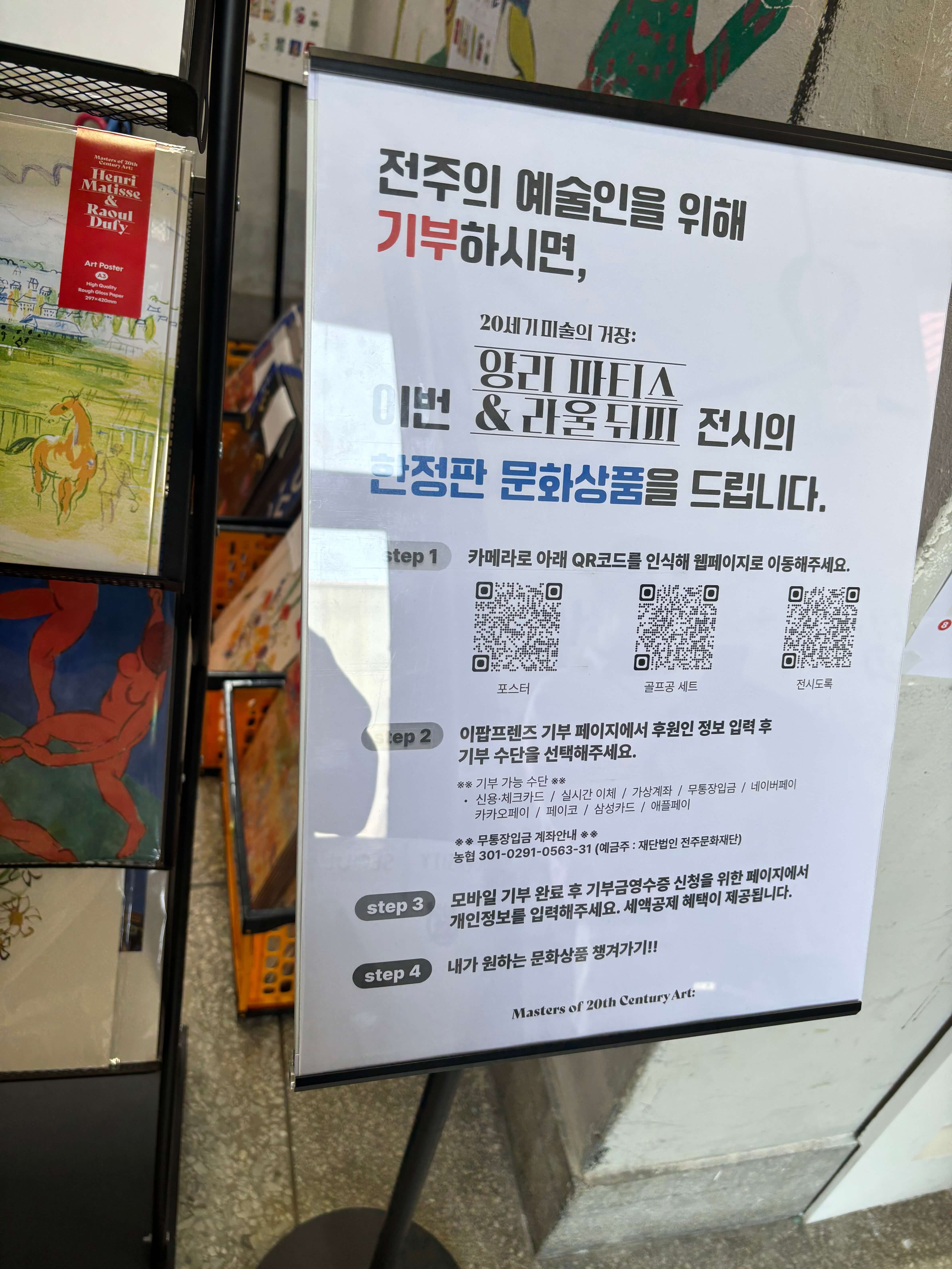 이번 전주 팔복예술공장에서 열린 앙리 마티스와 라울 뒤피 전시를 관람한 뒤, 전주문화재단의 기부기념품 운영 방식은 저에게 깊은 인상을 남겼습니다. 단순한 물건 판매가 아닌, 기부를 통해 공익적 가치를 실현하고, 전시를 기획한 주체가 전주문화재단임을 자연스럽게 알리는 구조였기 때문입니다. 관람객 입장에서는 미술 감상의 여운을 기념품으로 남기며 동시에 지역 예술인을 위한 기부를 실천할 수 있었고, 이는 매우 의미 있는 경험이었습니다.