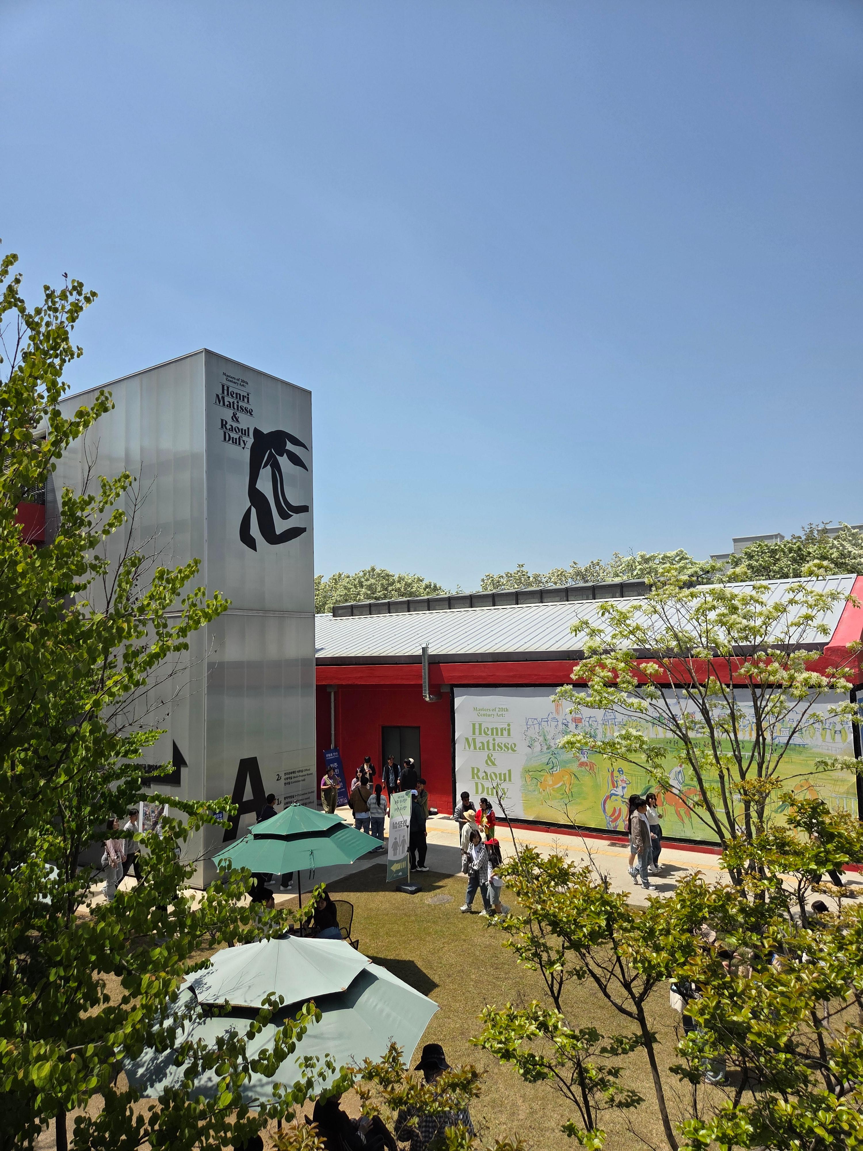 지방에서 미술관을 방문한다는 것이 결코 쉬운 일은 아니지만, 전주는 달랐습니다. 팔복예술공장은 철길 주변의 이팝나무를 활용해 걷고 싶은 거리, 찾고 싶은 명소로 탈바꿈해 있었고, 이팝나무 철길은 1년에 단 6일만 개방되는 희소성 덕분에 많은 분들이 이곳을 찾았습니다. 그렇게 자연스럽게 미술관으로의 동선이 연결되었고, 전시장 입구 벽면에는 앙리 마티스와 라울 뒤피 전시에 대한 안내 현수막이 걸려 있어 발길을 유도했습니다.